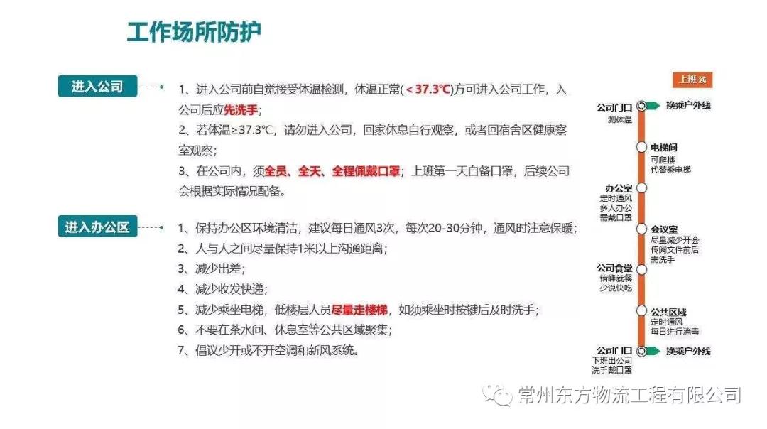 在積極響應(yīng)國家號召延時開工的決策以后,常州東方物流工程有限公司(簡稱:常州東方倉儲)嚴(yán)格遵守國家、省、市、區(qū)新型冠狀病毒疫情防控工作領(lǐng)導(dǎo)小組各項要求,于2020年2月10日開始部署各項防控措施,以確保企業(yè)復(fù)工后公司正常運行。