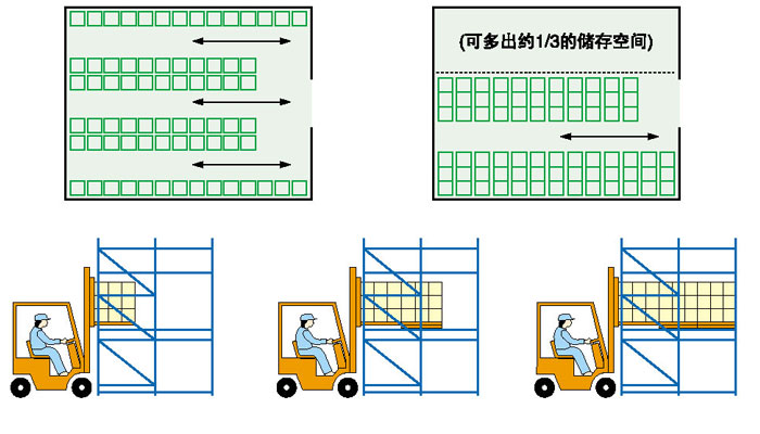 推入式貨架通過貨架內傾斜的導軌以及導軌上的帶輪小車,由叉車將貨物放在小車上,然后按圖示①②③將貨物依次逐一推入貨架,^多時可推入6個托盤,并在取貨時逐一取出。